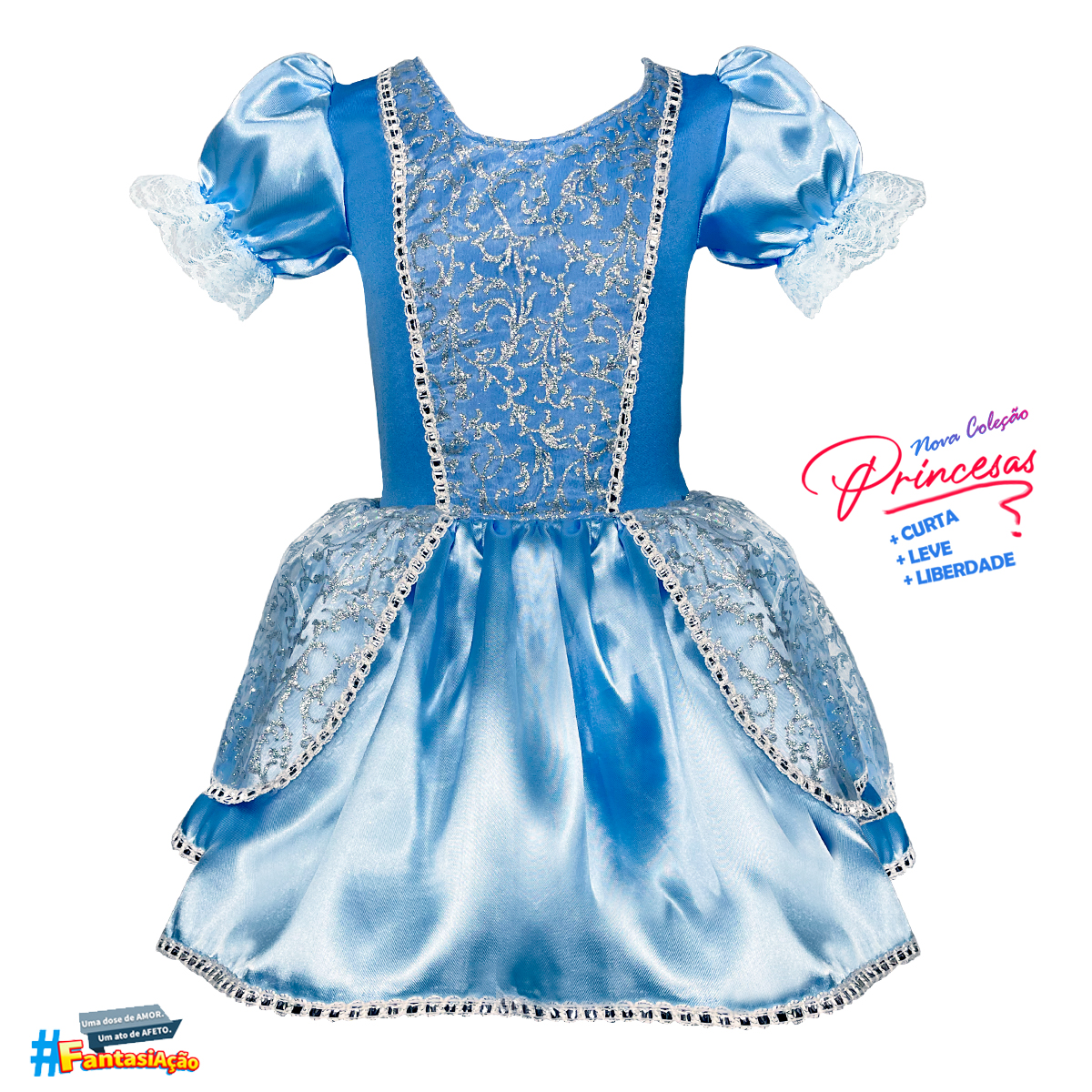Todas as princesas com o modelo de saia mais curta, mais leve dando ainda mais liberdade para todo tipo de brincadeira e movimento que sua princesa possa realizar.